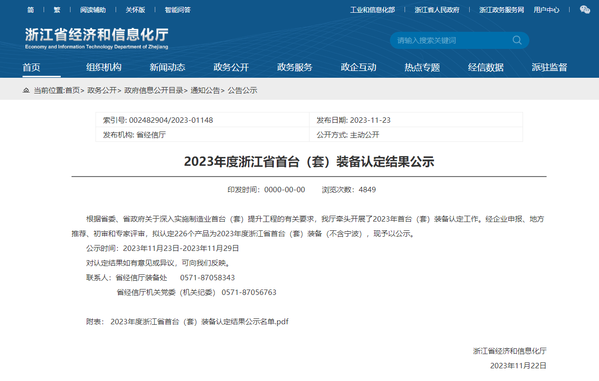 根据省委、省政府关于深入实施制造业首台(套)提升工程的有关要求,我厅联合省财政厅开展了2023年首台(套)装备认定工作。经企业申报、地方推荐、初审和专家评审,拟认定226个产品为2023年度浙江省首台(套)装备,现予以公示。