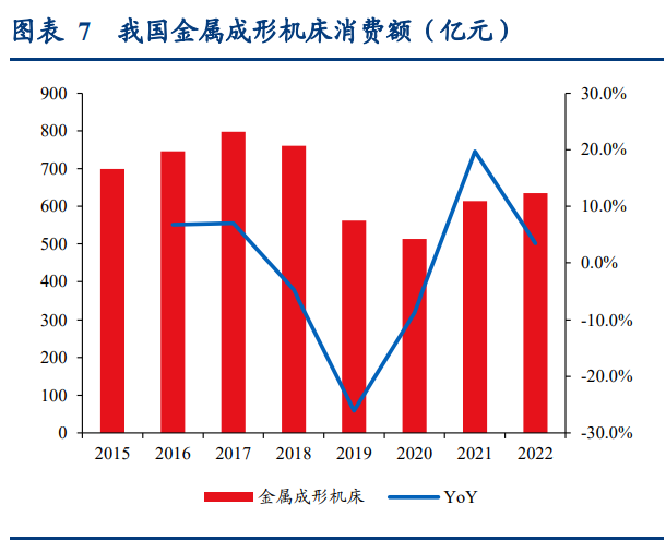 自2015年起,我国机床行业已历经两个3-4年的小周期。2021年,我国金属加工机床消费额高达1847亿元,较上一年增长了25.6%。但到了2022年,由于受到制造业景气度的波动影响,机床行业出现了小幅下滑。具体到金属切削机床市场,由于受到2021年高基数的影响以及制造业景气度的波动,2022年该领域出现了4.3%的下滑。然而,金属成形机床的新增订单及在手订单同比有明显的增长,这促使该领域在2022年实现了3.4%的增长。总体来说,我国机床行业在经过一段时间的高速增长后,于2022年面临小幅度的调整。